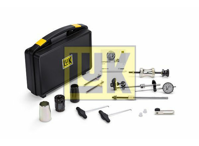 wird. Nach dem Einbau muss das Axialspiel der Doppelkupplung mit Distanzscheiben eingestellt werden. Die hierfür erforderlichen Messwerkzeuge sowie deren Aufnahme am Getriebegehäuse sind ebenfalls Bestandteile des Werkzeugsatzes.