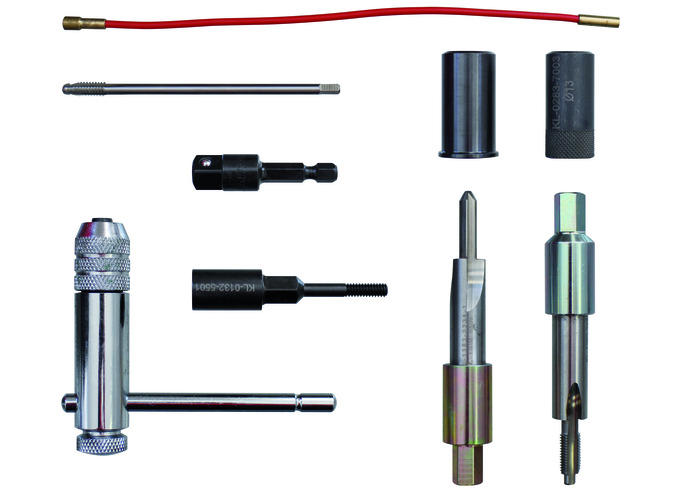 Der Universal Glühkerzen-Werkzeugsatz ermöglicht das schnelle und einfache Ausbohren von beschädigten bzw. abgerissenen Glühkerzen. Die Glühkerze bzw. der Glühkerzenkopf wird mit dem Kernlochbohrer aus-. bzw. aufgebohrt. Anschließend wird das Originalgewinde mit dem Spezial-Gewindebohrer nachgeschnitten und gereinigt. Der verbleibende Glühkerzenkörper wird dann mit dem Gewindebohrer oder mit dem Zugbolzen in Verbindung mit einem Schlagauszieher herausgezogen. Universell passend für Alfa, Fiat, Lancia, Opel und Saab 1.9 sowie 2.4 D / TiD / JTD / JTDM / CDTI Dieselmotoren mit einem Glühkerzen-Aufnahmegewinde von M9x1. Eingebaut z.B. bei Alfa 147, 156, 159, 166, GT; Opel Astra H, Astra V, Signum, Vectra C, Zafira; Saab 9-3; Fiat Croma, Stilo; Lancia Thesis etc. (Motorcode: 192A5.000, 841G.000, 841H.000, 937A5.000, 939A2.000, 939A3.000, 939A8.000, Z19DTH, Z19DTJ)