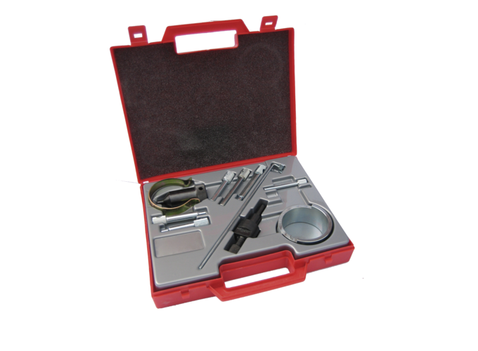 Werkzeugsatz um die Nockenwelle und die Kurbelwelle bzw. Nebenaggregate, die vom Zahnriemen angetrieben werden beim Wechseln des Zahnriemens richtig positionieren zu können. Inkludiert ist ein Werkzeug zum Verdrehen od. Positionieren für Motoren mit nicht verstellbaren Wellenriemenscheiben.
