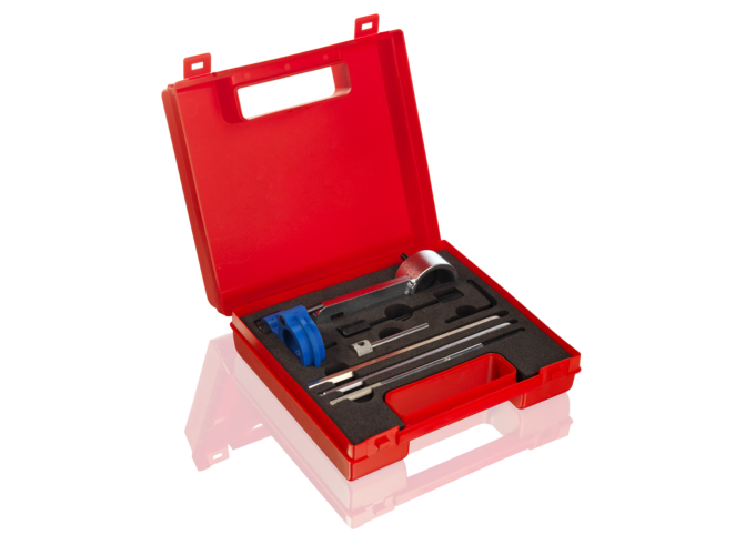Werkzeugsatz um die Nockenwelle und die Kurbelwelle bzw. Nebenaggregate, die vom Zahnriemen angetrieben werden beim Wechseln des Zahnriemens richtig zu positionieren - inklusive der Montagehilfe für Frontmaske. Dies wird benötigt, um die Front während des Austausches des Antriebsriemens in die Serviceposition zu bringen.